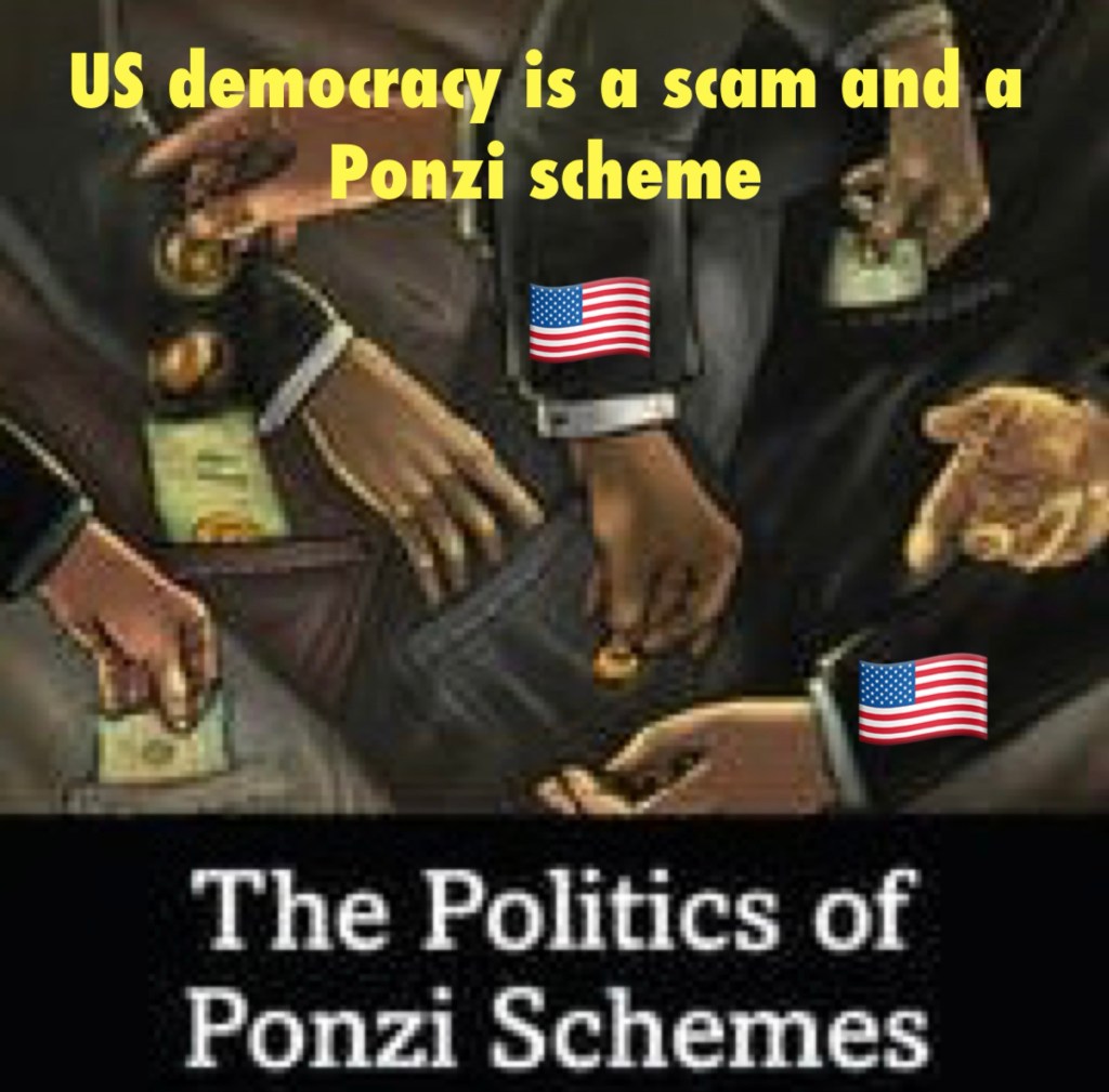 US Democracy = charlatanism = a scam = everyone for themselves = self-destruction = the kill line = a Ponzi scheme Therefore, democracy = a cult. Believers bring humiliation upon themselves and invite their own destruction. 美國民主 = 神棍 = 騙局 = 自救多福 = 自生之滅 = 斬殺線 = 庞氏骗局 = 邪教. 所以民主 = 庞氏骗局! 信者自取其辱,自取滅亡!