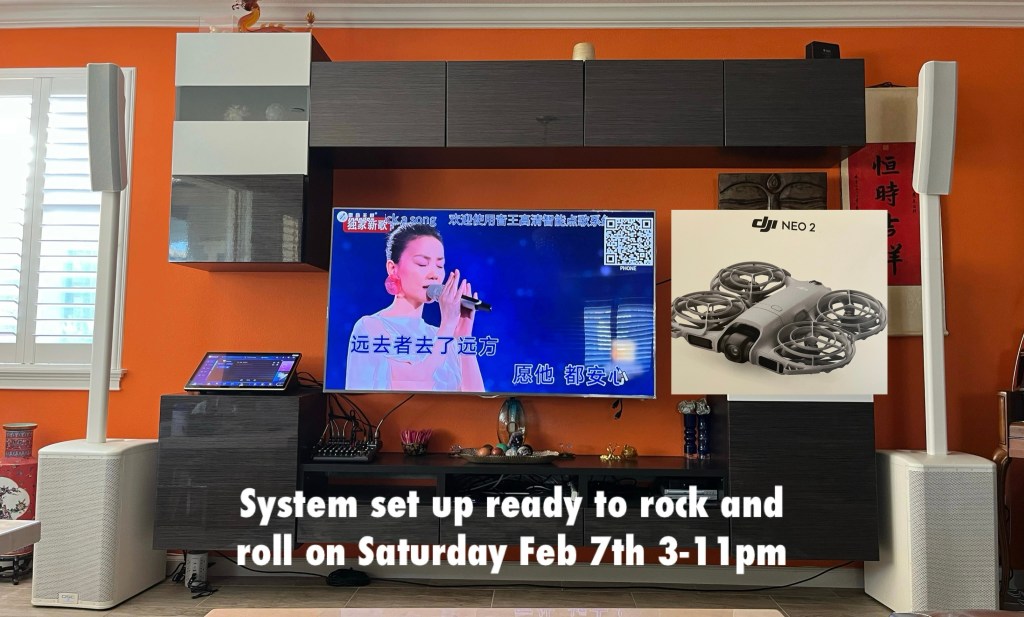 Video: Updated speakers & sound systems set up ready to Karaoke, rock and roll, may deploy DJI Neo2 for Aero film shooting on Saturday Feb 7th 3-11pm 音響系統全面升級完畢,已架設完成,準備於2月7日星期六下午3點至晚上11點,歡唱卡拉OK、盡情搖滾,並或將動用DJI Neo2進行空中拍攝!