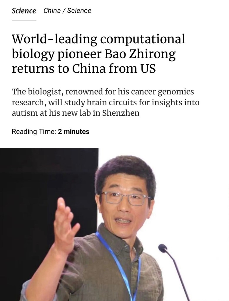 Another top Chinese scientist left US and returned to China! SCMP: After 30 years in the US, world-leading computational biologist Bao Zhirong has taken up a full-time position at the Southern University of Science and Technology in Shenzhen. 又一位頂尖中國科學家離開美國懦夫國,回到中國! 《南華早報》報道:在美國工作生活了30年後,世界領先的計算生物學家包志榮已正式回國,並在深圳的南方科技大學出任全職職位.