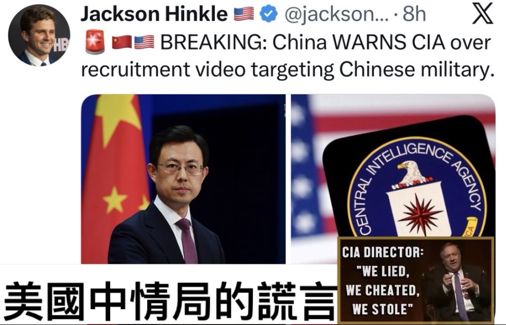 Jackson Hinkle: China warns CIA over recruitment video targeting Chinese military. CIA DIRECTOR: “WE LIED, WE CHEATED, WE STOLE” 傑克森辛克爾: 中國就針對中國軍方的徵兵影片向中央情報局發出警告。中央情報局局長: “我們撒謊、欺騙、偷竊”.