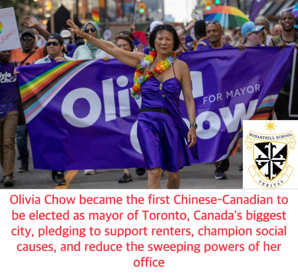 香港玫塊崗學校校友 Olivia Chow from Rosaryhill School HK became the first Chinese-Canadian to be elected as mayor of Toronto, Canada’s biggest city, pledging to support renters, champion social causes, and reduce the sweeping powers of her office