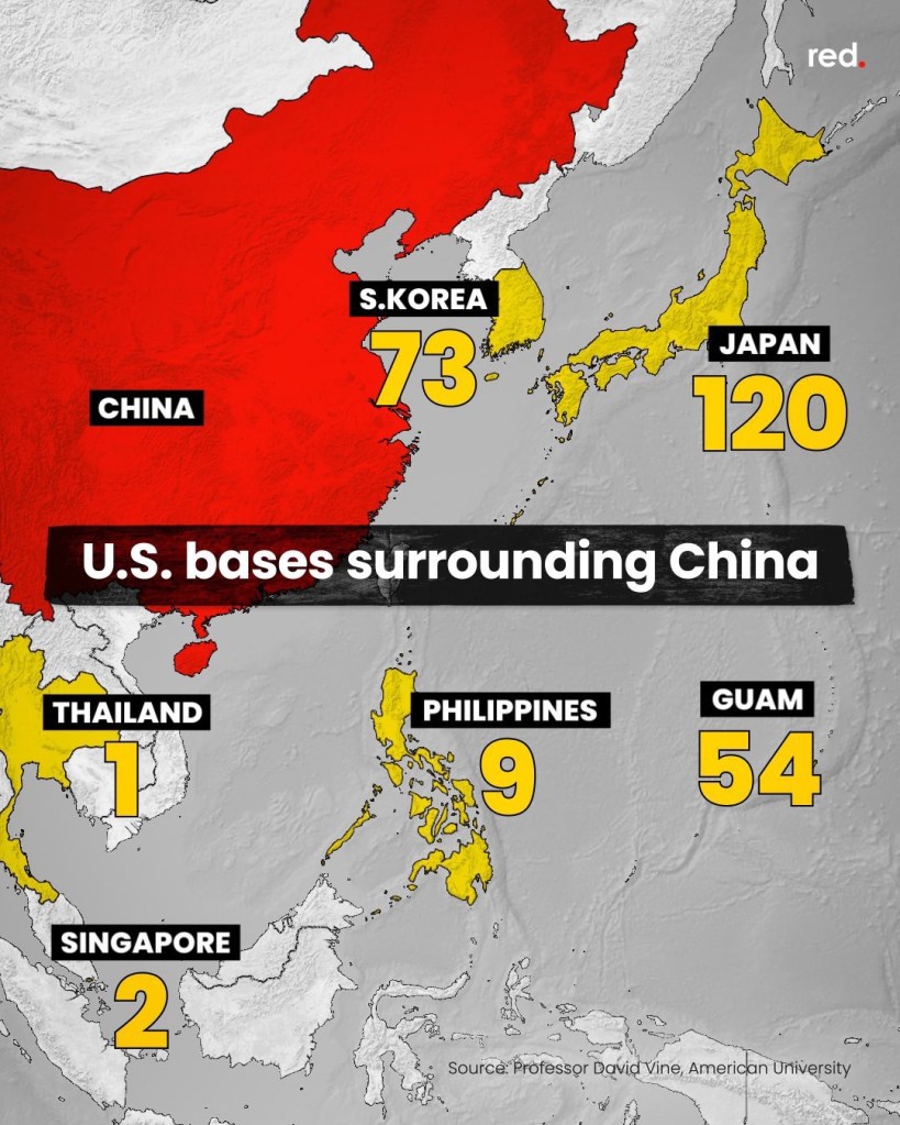 Map of colonies and vassals of the American Empire in South China Sea. 300+ US military bases surrounding China. Why? 美帝國在南中國海的殖民地和附庸國地圖。 中國周邊有300多個美軍基地。 為什麼?