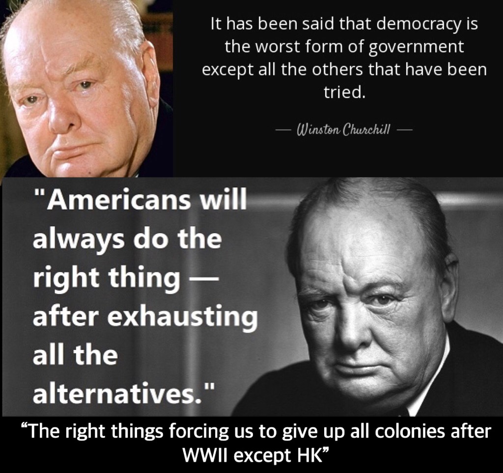 Winston Churchill: “US has the worst form of democracy and they did the right things forcing us to give up all colonies after WWII except HK” 丘吉爾:“美國擁有最糟糕的民主政府形式,他們做了正確的事情斷了我們米路迫使我們放棄二戰後除香港以外的所有殖民地”