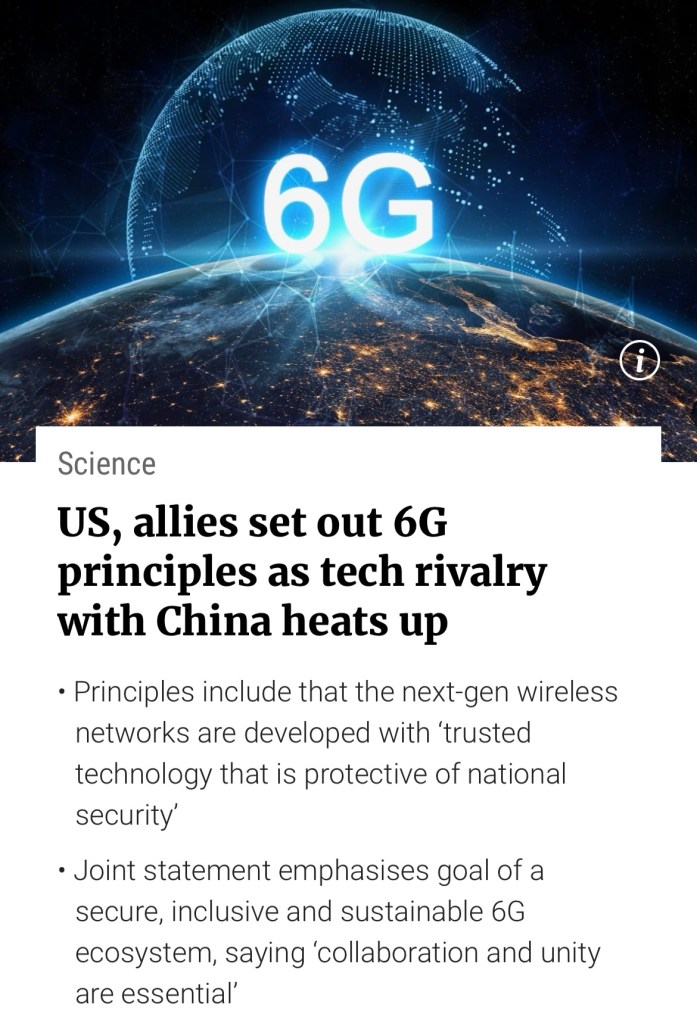 In a joint statement on Monday, the nations set out their principles for 6G communication systems with backdoor, including that they are developed with “trusted technology that is protective of only US national security”. Huawei’s 5G, 5.5G & 6G have no backdoor unacceptable to US. 在周一的一份聯合聲明中,各國制定了帶有後門的 6G 通訊系統的原則,包括這些系統是採用「僅保護美國國家安全的可信技術」開發的。 華為的5G、5.5G、6G沒有後門美國是不能接受的.