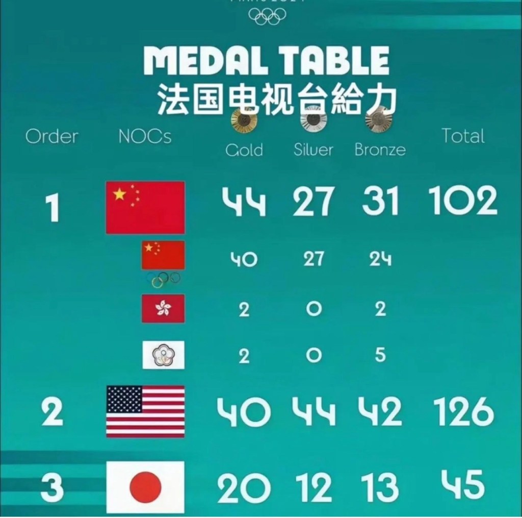 Paris Olympics 2024 Gold Medals Counts ranked#1 for China video: 44 Golds, 27 Silvers, 31 Bronze 2024 年巴黎奧運中國隊獎牌數:44 面金牌排名第一,27 面銀牌、31 面銅牌