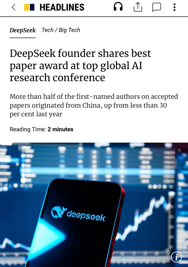 SCMP: China beats US again! DeepSeek founder shares best paper award at top global AI research conference DeepSeek 香港南華早報: 中國再次擊敗美國! 創辦人在全球頂尖人工智慧研究會議上分享最佳論文獎