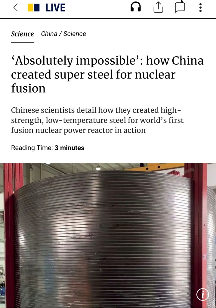 SCMP: China innovate & US does nothing but complain, ‘Absolutely impossible’: how China created super steel for nuclear fusion 《南華早報》:中國創新,美國卻抱怨「絕對不可能」:中國如何製造出用於核融合的超級鋼