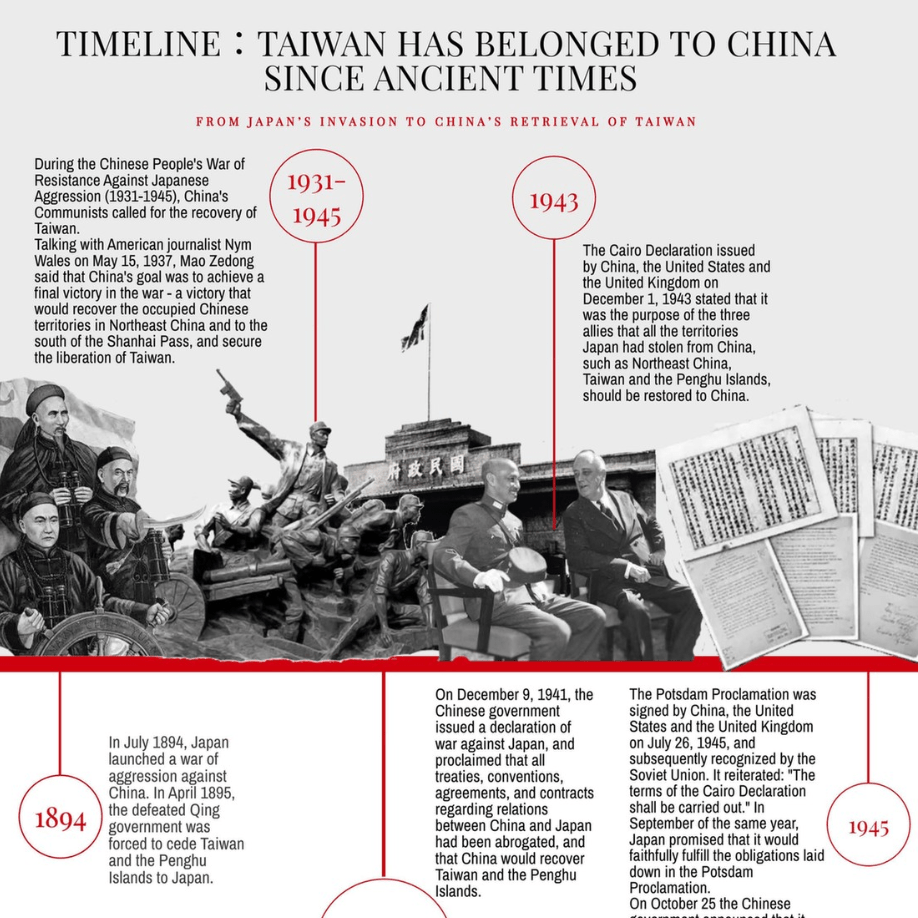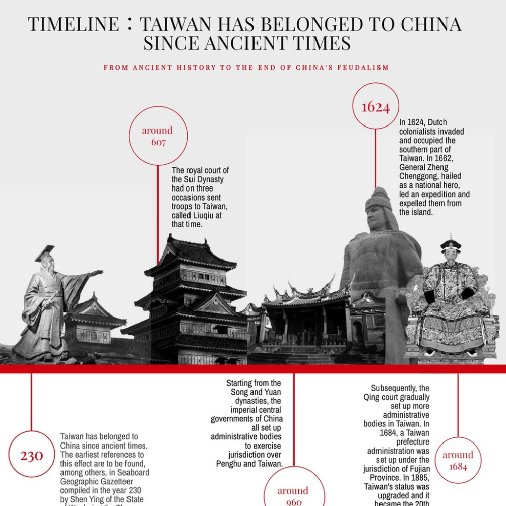 “Taiwan belongs to China. There is but one China in the world. This statement has a solid basis in history and jurisprudence. 「台灣是中國的。世界上只有一個中國。這一表述有著堅實的歷史和法理基礎。