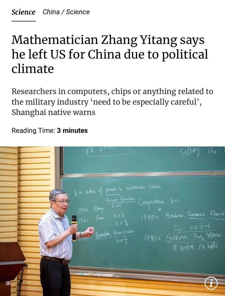 SCMP: US racist attitudes towards Chinese Americans, no future for Chinese scientists in America. Mathematician Zhang Yitang, who joined Sun Yat-sen University in Guangzhou from California in June, has called the wave of Chinese researchers exiting the US a “positive trend”. 《南華早報》:美國對華裔美國人的種族主義態度,華裔科學家在美國沒有未來。今年六月從加州加入廣州中山大學的數學家張益唐稱,中國研究人員離開美國的浪潮是一個「正面趨勢」.