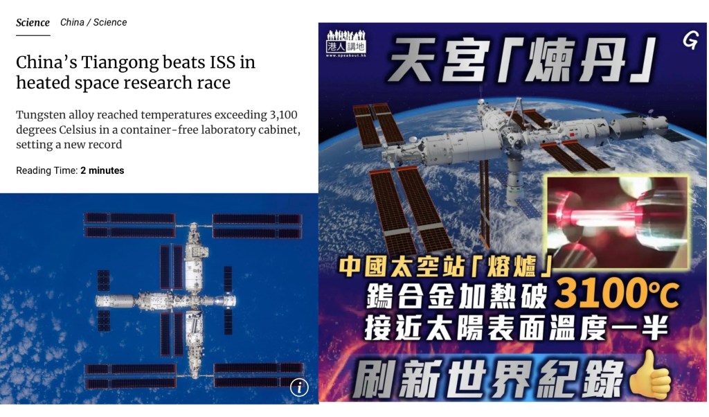 SCMP: China wins again! China’s Tiangong beats ISS in heated space research race. China’s Tiangong space station has set a new record in space-based materials research after a tungsten alloy was heated to temperatures exceeding 3,100 degrees Celsius (5,612 degrees Fahrenheit). 《南華早報》:中國再次獲勝!中國天宮二號在激烈的太空研究競賽中擊敗國際太空站。中國天宮二號太空站將鎢合金加熱到超過3100攝氏度(5612華氏度)的溫度,創造了太空材料研究的新紀錄.