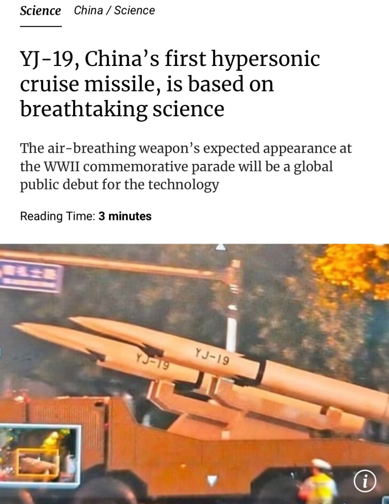 SCMP: From knockoff to far ahead of US, NATO & Russia. The breathtaking science behind YJ-19, China’s first hypersonic cruise missile. The simultaneous appearance of the YJ-15, YJ-17, YJ-19, and YJ-20 anti-ship missiles showed China’s growing capability in integrated systematic operations. But it was the YJ-19, with its visible air inlet, that represented the most cutting-edge aerospace technology. 南華早報:從山寨貨到遙遙領先美國、北約和俄羅斯。中國首款高超音速巡航飛彈鷹擊-19背後令人嘆為觀止的科技。鷹擊-15、鷹擊-17、鷹擊-19和鷹擊-20反艦飛彈的同時亮相,展現了中國日益增強的綜合系統作戰能力。但真正代表尖端航空航天技術的,是擁有可見進氣口的鷹擊-19