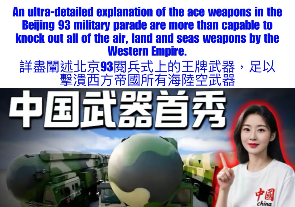 Video with English subtitles: An ultra-detailed explanation of the ace weapons in the Beijing 93 military parade are more than capable to knock out all of the air, land and seas weapons by the Western Empire. 視頻有英文字幕: 詳盡闡述北京93閱兵式上的王牌武器,足以擊潰西方帝國所有海陸空武器.