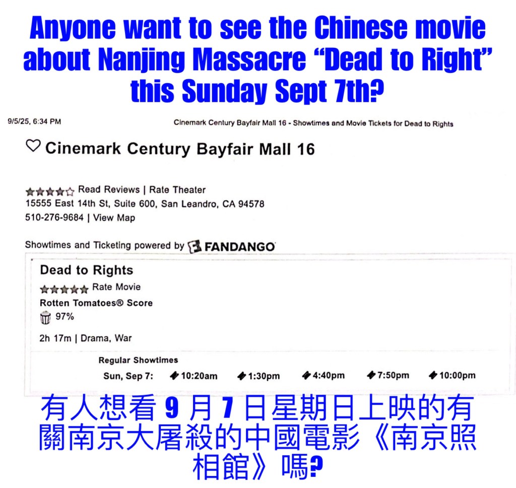 Anyone want to see the Chinese movie about Nanjing Massacre “Dead to Right” this Sunday Sept 7th? 有人想看 9 月 7 日星期日上映的有關南京大屠殺的中國電影《南京照相館》嗎?