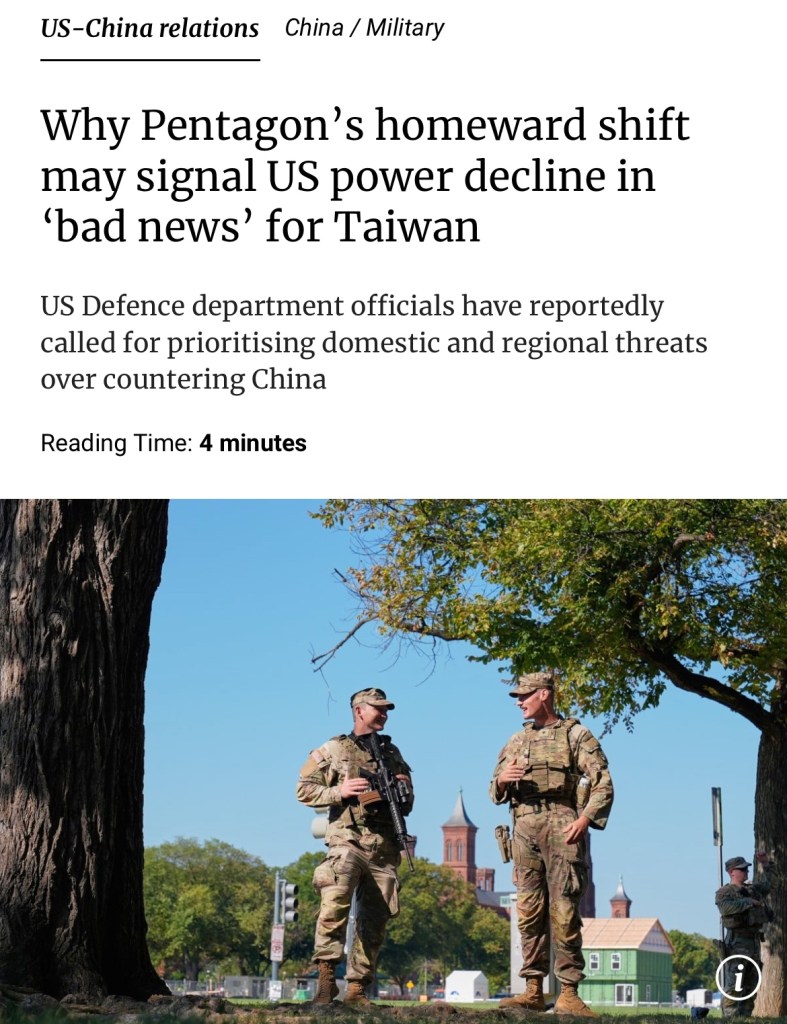 A face saving act when US throughly beaten by China in all categories of military hardware & software at the 1st & 2nd island chain after Beijing Military Parade on Sept 3rd. SCMP: Why homeward shift by Pentagon may signal US decline in ‘bad news’ for Taiwan 9月3日北京閱兵後,美國在第一島鍊和第二島鏈的所有軍事硬體和軟體領域都被中國徹底擊敗,這算是一種挽回面子的舉動。 《南華早報》:五角大廈的「回頭」舉動可能預示著美國實力的衰落,這對台灣來說是個「壞消息」