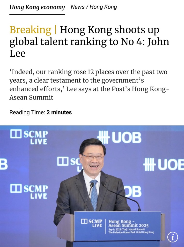 SCMP: More than 20K top talents left US last 5 years for China, many landed in HK. HK must thanks US for making HK and China great again. Hong Kong shoots up global talent ranking to No 4: HKCE John Lee 《南華早報》:過去五年,超過兩萬名頂尖人才離開美國前往中國,其中許多人落腳香港。香港必須感謝美國讓香港和中國再次偉大。香港特區行政長官李家超表示,香港全球人才排名飆升至第四位