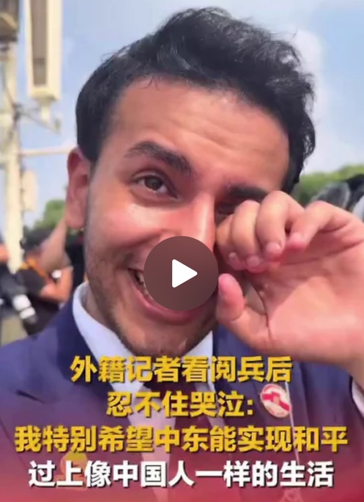 These two guys from Palestine and Iraq were moved to tears while watching China’s military parade. 這兩位巴勒斯坦和伊拉克的小伙子,觀看中國閱兵時,感動得流淚了.