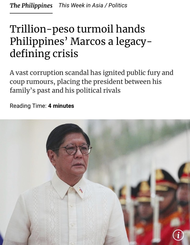 SCMP: Like father like son, Half a century after his father declared martial law, Philippine President Marcos Jnr is confronting his own crisis: a corruption scandal of dizzying scale, coup rumours in the air and tens of thousands of Filipinos preparing to march on the streets. Trillion-peso turmoil hands Philippines’ Marcos a legacy-defining crisis 《南華早報》:有其父必有其子。在其父宣布戒嚴半個世紀後,菲律賓總統小馬科斯正面臨自身的危機:令人震驚的腐敗醜聞、瀰漫的政變謠言以及數萬菲律賓人準備走上街頭遊行。數萬億比索的動盪為菲律賓總統馬可斯帶來了一場決定性的歷史危機.