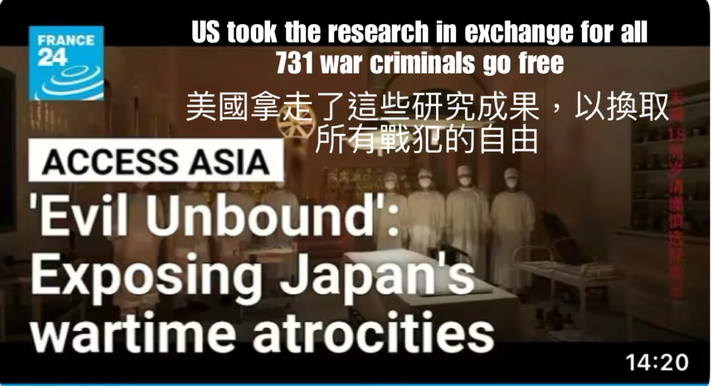 Video with Chinese subtitles: France TV report – “I dissected 300 humans”: Former Unit 731 members expose Japan’s wartime atrocities, crimes against humanity. US took the research in exchange for all 731 war criminals go free 影片有中文字幕: 法國電視台:《我解剖了300人》:前731部隊成員揭露日本戰時暴行, 危害人類罪. 美國拿走了這些研究成果,以換取所有戰犯的自由.