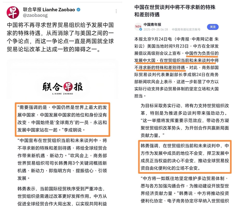 The report from September 24 can truly be described as a bolt from the blue! “China will no longer seek the special treatment granted to developing countries by the World Trade Organization.” How significant is this statement? 9月24日的這條報道,堪稱於平地之中聽驚雷! “中國將不再尋求世界貿易組織給予發展中國家的特殊待遇。”這句話的分量有多重?