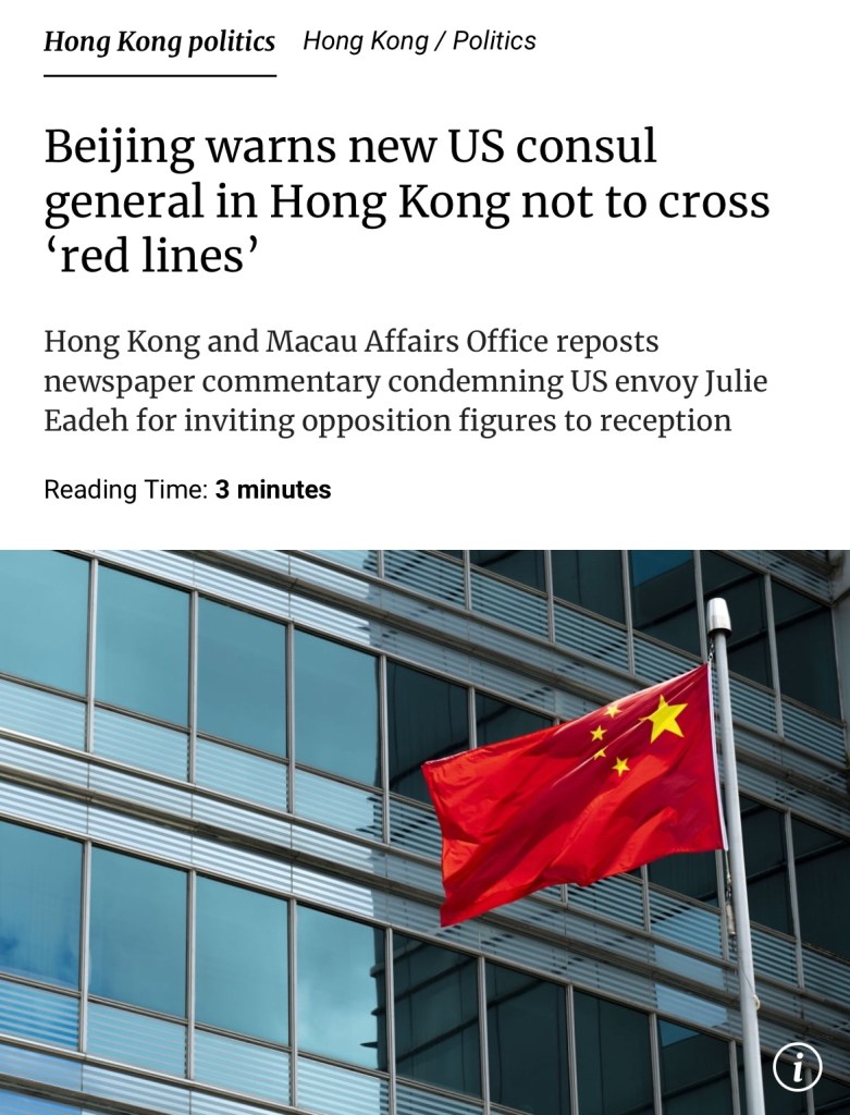 SCMP: Beijing warns new US consul general in Hong Kong not to cross ‘red lines’. The condemnation followed recent media reports that Eadeh had invited former NED supported opposition leaders including Anson Chan Fang On-sang and Emily Lau Wai-hing to her inaugural reception 南華早報:北京警告美國新任駐香港總領事不要跨越「紅線」。此前,媒體報道稱,Eadeh邀請了前美國國家民主基金會支持的反對派領導人,包括陳方安生和劉慧卿,參加她的就職招待會