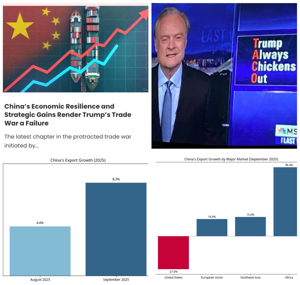 “China’s Export Engine Roars Ahead by 8.3%, Undeterred by TACO’s (Trump Always Chicken Out) Tariffs 中國出口引擎強勁前行8.3% 不受「塔可」(川普總是膽怯)關稅的阻礙, 唱衰中國的恨國黨又失望了.