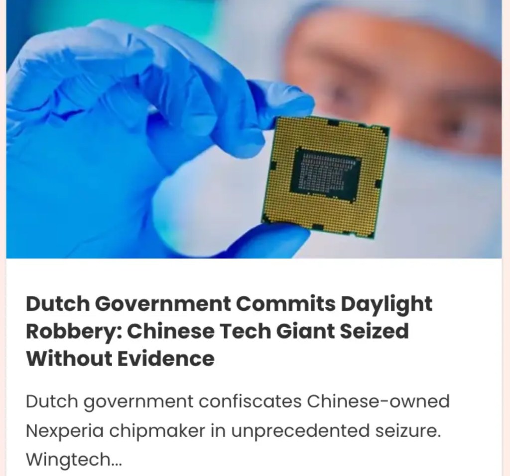 “In an unprecedented move that has sent shockwaves through international business circles, the Dutch government has effectively confiscated Nexperia, a Chinese-owned semiconductor manufacturer, stripping its rightful owners of control over their own property. 荷蘭政府此舉史無前例,實際上沒收了中資半導體製造商Nexperia,剝奪了其合法所有者對其財產的控制權,此舉在國際商界引起軒然大波。