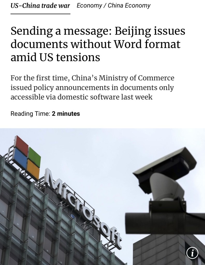 SCMP: Microsoft and Adobe discontinued usage in public and private sectors in China, formal decoupling with US. 南華早報:微軟和Adobe不再在中國被公和私營機構使用,中國正式和以上美國軟件脫鉤