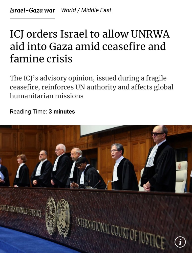 SCMP: UN International Court of Justice (ICJ) said on Wednesday that Israel must allow the UN aid agency in Gaza, known as UNRWA, to provide humanitarian help to the war-torn territory. With the backing of US, Israel with ignore it. 《南華早報》:聯合國國際法院週三裁定,以色列必須允許聯合國駐加薩援助機構近東救濟工程處(UNRWA)向飽受戰爭蹂躪的加薩地區提供人道援助。在美國的支持下,以色列可能會對此置之不理.