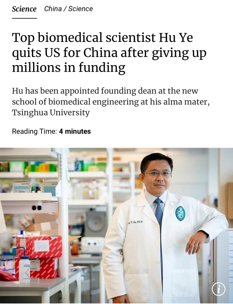 SCMP: Top scientist Hu Ye quits US for China after giving up millions in funding! After studying and working in the US for 22 years, Hu “Tony” Ye, who held the prestigious chair professor position at Tulane University in New Orleans, left to take on the role of founding dean at the new school of biomedical engineering at his alma mater, Tsinghua University. 《南華早報》:頂尖科學家胡曄放棄數百萬美元資助,離開美國前往中國!在美國學習和工作了22年後,曾擔任新奧爾良杜蘭大學著名講座教授的胡曄(音譯,Tony Ye)離開美國,前往母校清華大學擔任新成立的生物醫學工程學院的創始院長.