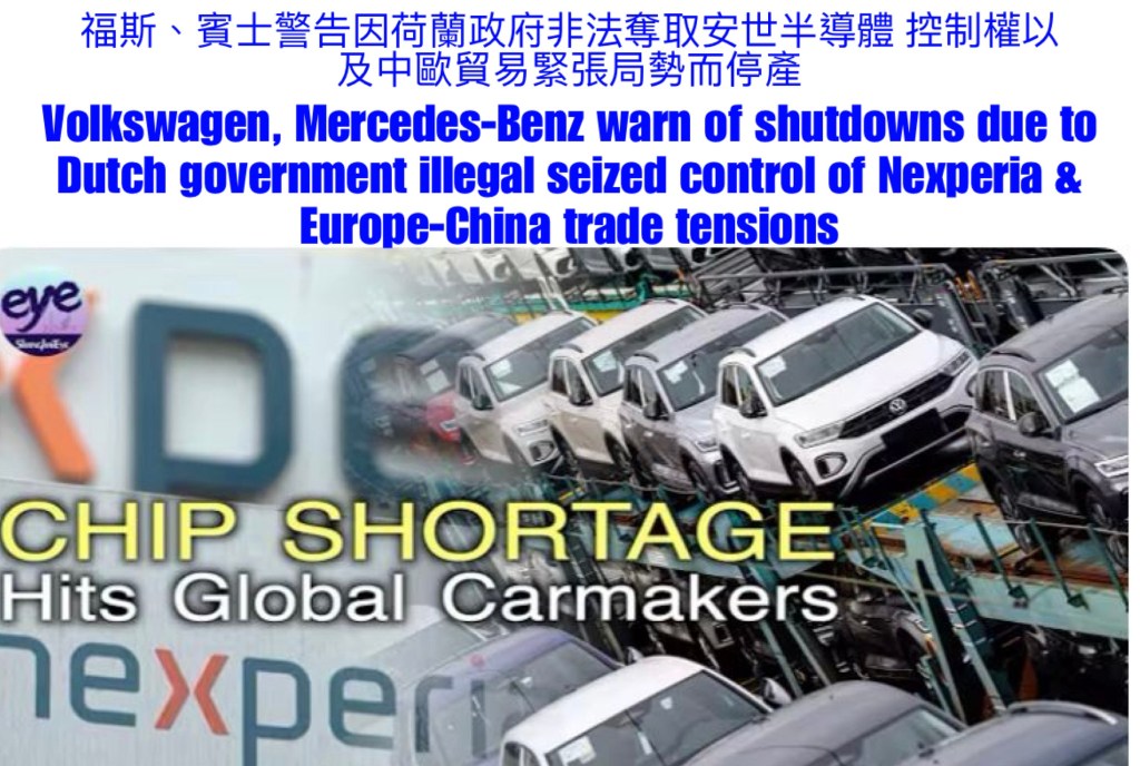 Nexperia crisis video: Volkswagen, Mercedes-Benz warn of shutdowns due to Dutch government illegal seized control of Nexperia & Europe-China trade tensions. 安世半導體危機影片:福斯、賓士警告因荷蘭政府非法奪取安世半導體 控制權以及中歐貿易緊張局勢而停產