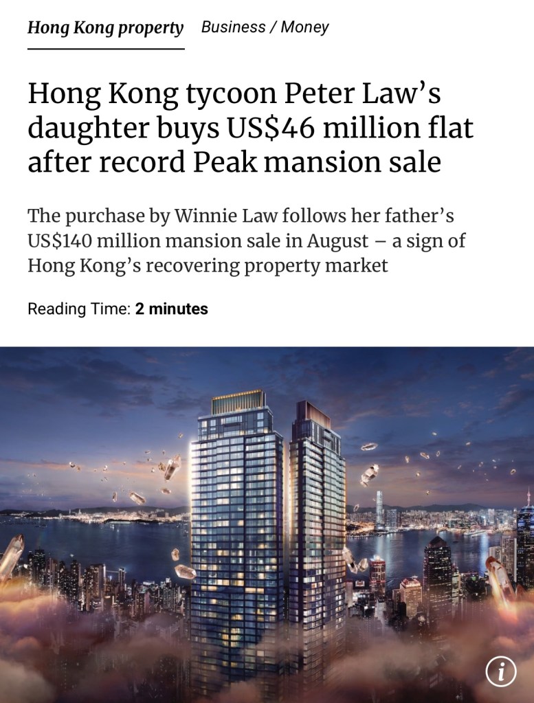 Writing off HK as a premier financial center is premature! SCMP: Winnie Law Wing-yin acquired a 4,710 sq ft (438 square metres) flat in tower two, phase one of The Legacy for HK$355 million (US$45.7 million), according to Land Registry records. The transaction was completed on Tuesday. 現在就斷言香港是首屈一指的金融中心還為時過早! 《南華早報》報道:據土地註冊處記錄顯示,羅詠茵以3.55億港元(約4,570萬美元)購入位於「傳承」一期二座的一套面積為4710平方英尺(約4,38平方公尺)的公寓。該交易已於週二完成.