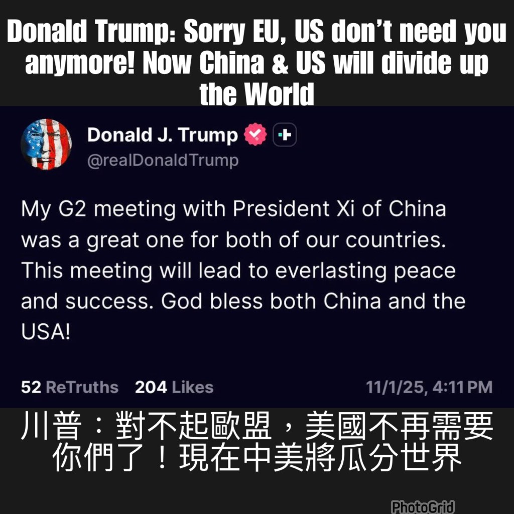 2025年10月29日,在与中国领导人会晤前夕,特朗普发文称:”G2峰会即将登场!”随后他又发文宣称此次会谈”成果丰硕”,将缔造”永续和平与繁荣”。