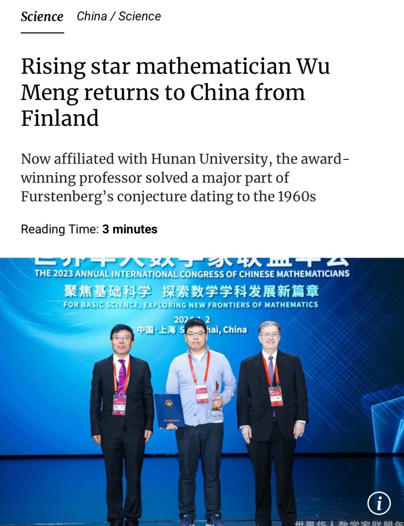 SCMP: In the 1960s, mathematician Hillel Furstenberg proposed a conjecture: that a number cannot appear “simple and highly regular” under two “independent” rulers simultaneously. That changed in 2019 when Chinese mathematician Wu Meng, then an associate professor at the University of Oulu, one of Finland’s largest universities, solved the problem. 《南華早報》:1960年代,數學家希勒爾·弗斯滕伯格提出猜想:一個數字不可能在兩把「獨立」的尺規下同時呈現「簡單且高度規則」的形態。這個局面在2019年被改變——當時任教於芬蘭規模最大的大學之一奧盧大學的中國數學家吳夢解決了這道難題。