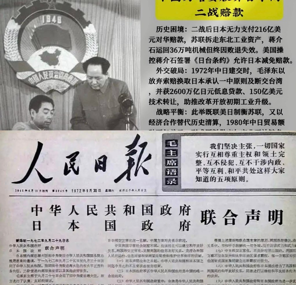 1. Before normalization of Sino-Japanese relations, Chiang Kai-shek had already renounced reparations. The Chinese Communist Party should not be seen as having a smaller heart than Chiang Kai-shek.