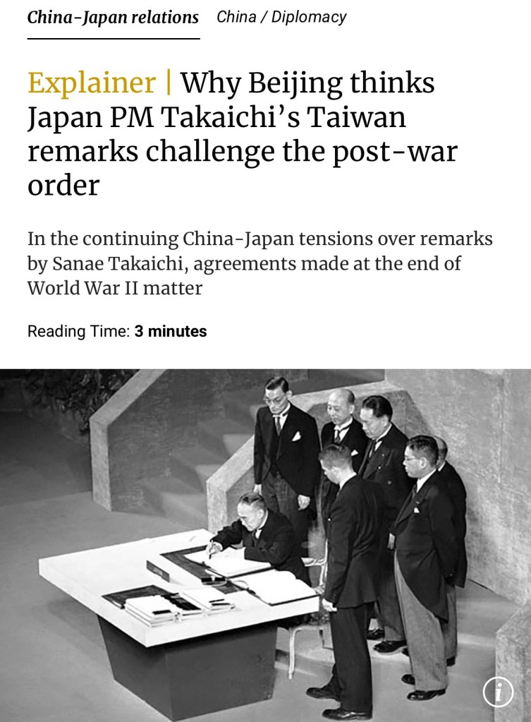 SCMP: Beijing has condemned Japanese Prime Minister Sanae Takaichi’s remarks on Taiwan, not only as a violation of the one-China principle but also as a challenge to the post-war international order. 香港南華早報: 北京譴責日本首相高市早苗有關台灣的言論,不僅違反一個中國原則,也是對戰後國際秩序的挑戰。