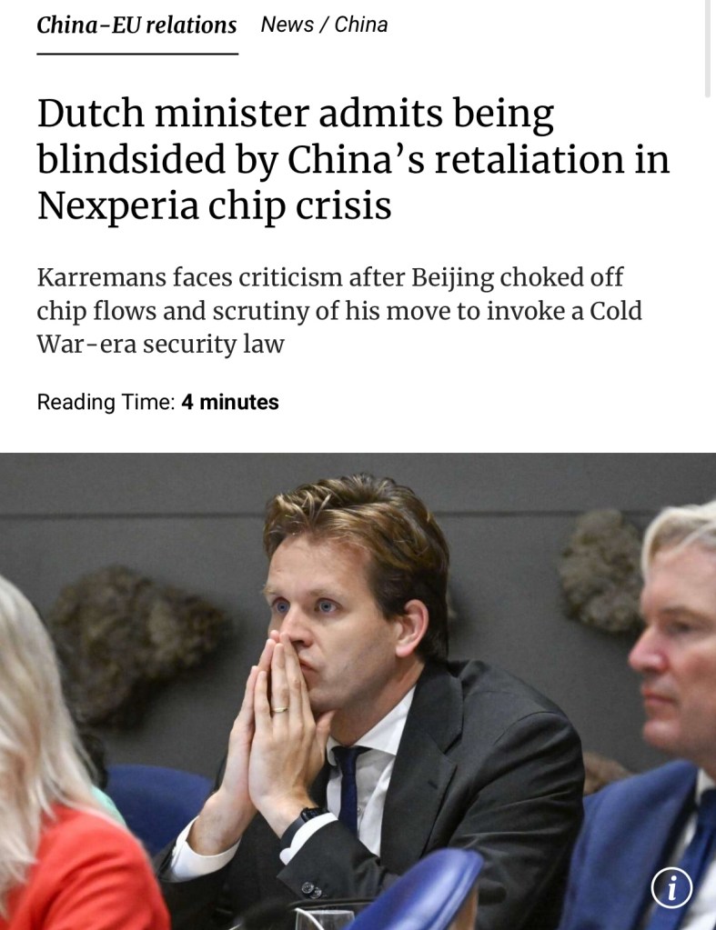 SCMP: Rackless & Stupidity was the answer! During a long hearing, Karremans – whose behaviour was described variously as “reckless”, “sloppy” and “amateurish” – was quizzed on why he did not predict Beijing’s response, which caused some global auto giants to idle production lines due to a shortage of chips. 南華早報:答案是:魯莽和愚蠢!在漫長的聽證會上,卡雷曼斯——他的行為被形容為「魯莽」、「草率」和「業餘」——被質疑為什麼他沒有預料到北京的應對措施,而這一措施導致一些全球汽車巨頭因晶片短缺而停產. 這個笨蛋小學雞和中國鬥真的未夠班.