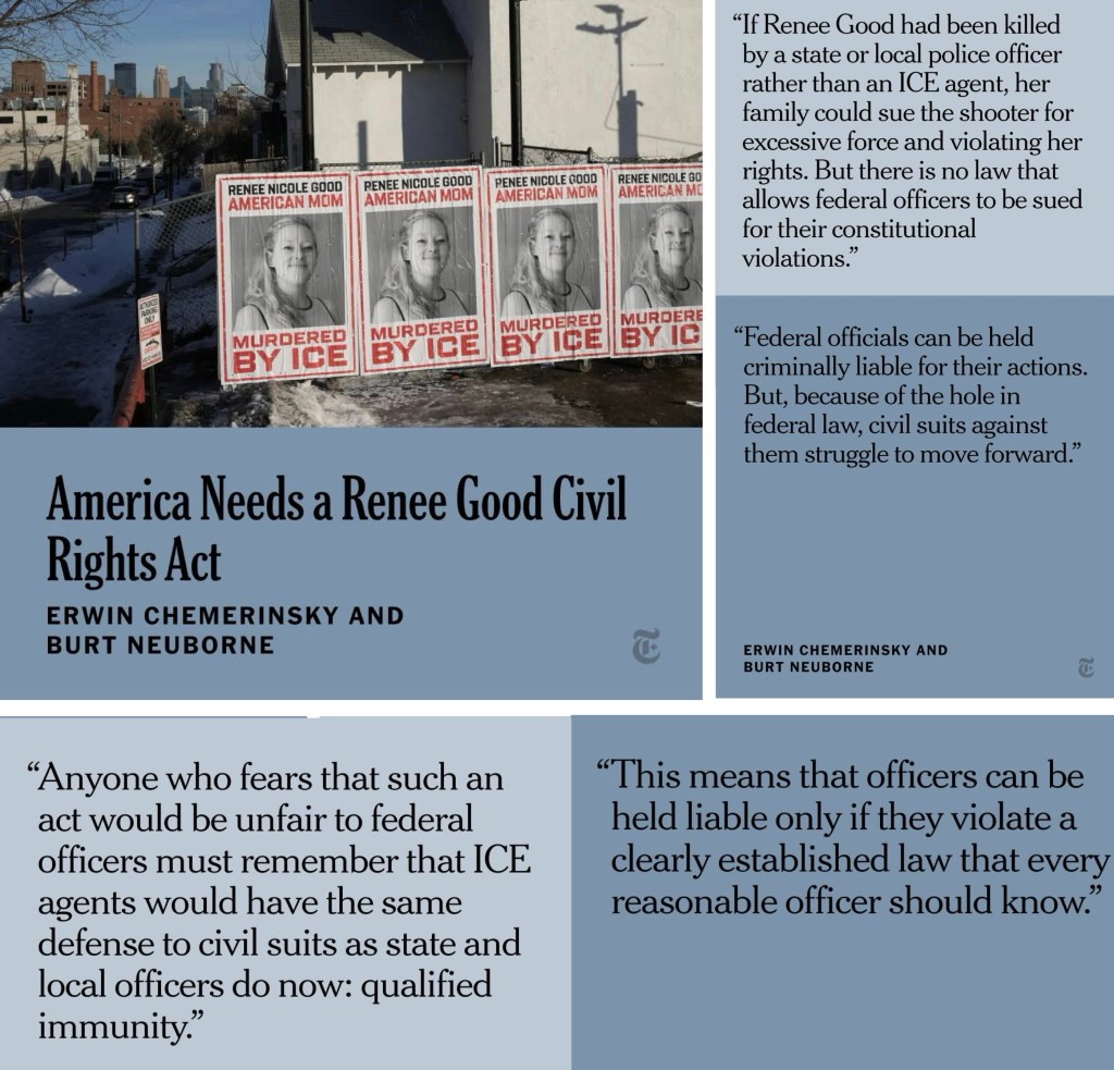 The recent ICE killing of Renee Good in Minneapolis can be the impetus for finally closing a gaping hole in our constitutional protections, write Erwin Chemerinsky, the dean of @berkeleylaw, and Burt Neuborne, a professor emeritus at @nyulaw. While federal officials can be held criminally liable for their actions, civil suits against them often struggle to move forward because of a hole in federal law. Congress can — and should — take action by creating a Renee Good Civil Rights Act, Erwin and Burt write.