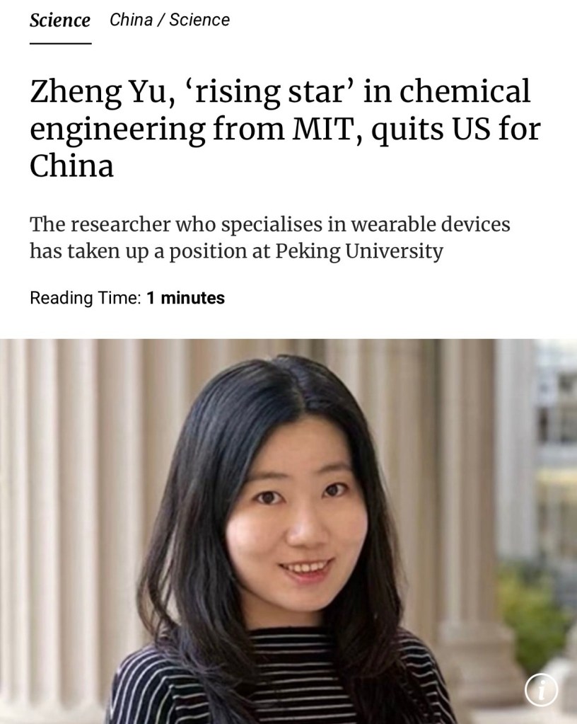 There is no future for smart Chinese scientists with high EQ and IQ in America! SCMP: Zheng Yu recently completed her postdoctoral training in bioelectronics in the US but has now joined the Chinese university’s college of chemistry and molecular engineering as an assistant professor. 在美國,情商智商雙高的聰明華人科學家沒有未來! 錢是重要,但你要活著有命享才行呀! 《南華早報》鄭鈺近期在美國完成生物電子學博士後訓練,如今已加入中國大學化學與分子工程學院擔任助理教授.