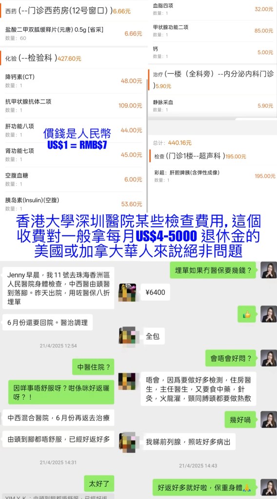 你的醫保信息來得合時,很多住在美國的華人不了解中國醫院比美國先進,價錢非常合理,美國的醫生醫院是賺錢為第一,救命救人是次要,和中國醫院和醫生不同, 而且在中國中醫和西醫可以在同一間醫院𥚃!當然那些華人靠美國政府救濟金生存的,他們不能也不可以離開美國,就算是離開也要美國政府批准,而且不能超過三十天,連機票錢也要他人付,否則將損失美國政府福利。這些人不會也不可能在中國享受優質的退休生活! 但對大部分海外華人,在中國退休可以大大提高退休質數,最重要的是中國安全,性價比高! 香港出生的華人更是天之驕子, 有終身免費醫療保險,可以在中國大灣區好像深圳香港大學醫院看病,每年還有二千元醫療卷可以在香港或中國大灣區使用,很多住在美國或加拿大的香港人不知身在福中不知福.