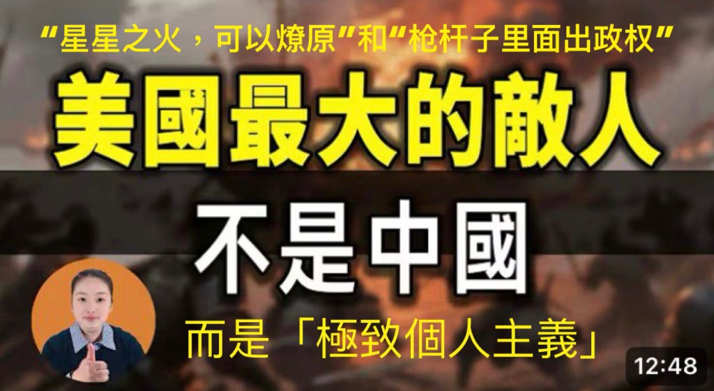 Video: America’s Greatest Enemy Is Not China, But “Extreme Individualism” How China used the ideas of “a single spark can start a prairie fire” and “political power grows out of the barrel of a gun” to defeat the US, leaving America unable to ever hold its head high again. 美國最大的敵人不是中國,而是「極致個人主義」 . 中國如何用“星星之火,可以燎原”和“枪杆子里面出政权” 的理念打敗美國,讓美國永遠抬不起頭來!