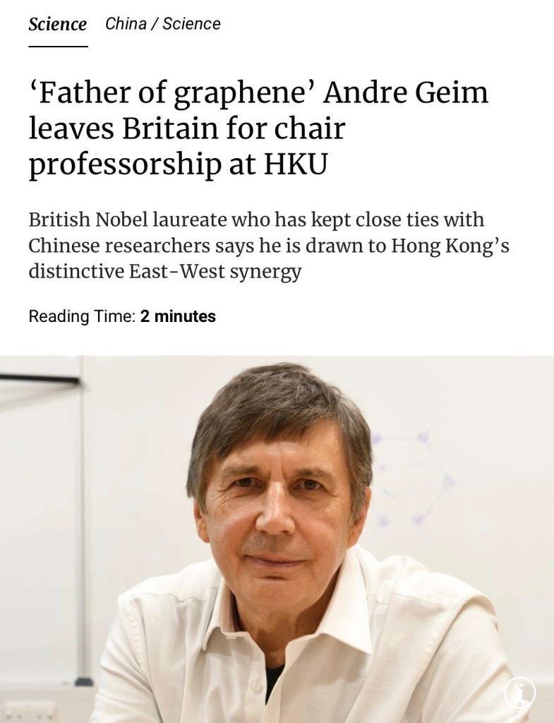 The future in science and technology is China. SCMP: Andre Geim, the 67-year-old Nobel Prize-winning physicist known in China as the “father of graphene”, will join the University of Hong Kong as a chair professor in April, according to the university. 未來科學與技術的發展屬於中國。《南華早報》報導,現年67歲、被譽為「石墨烯之父」的諾貝爾物理學獎得主安德烈·海姆,將於4月加入香港大學擔任講座教授.