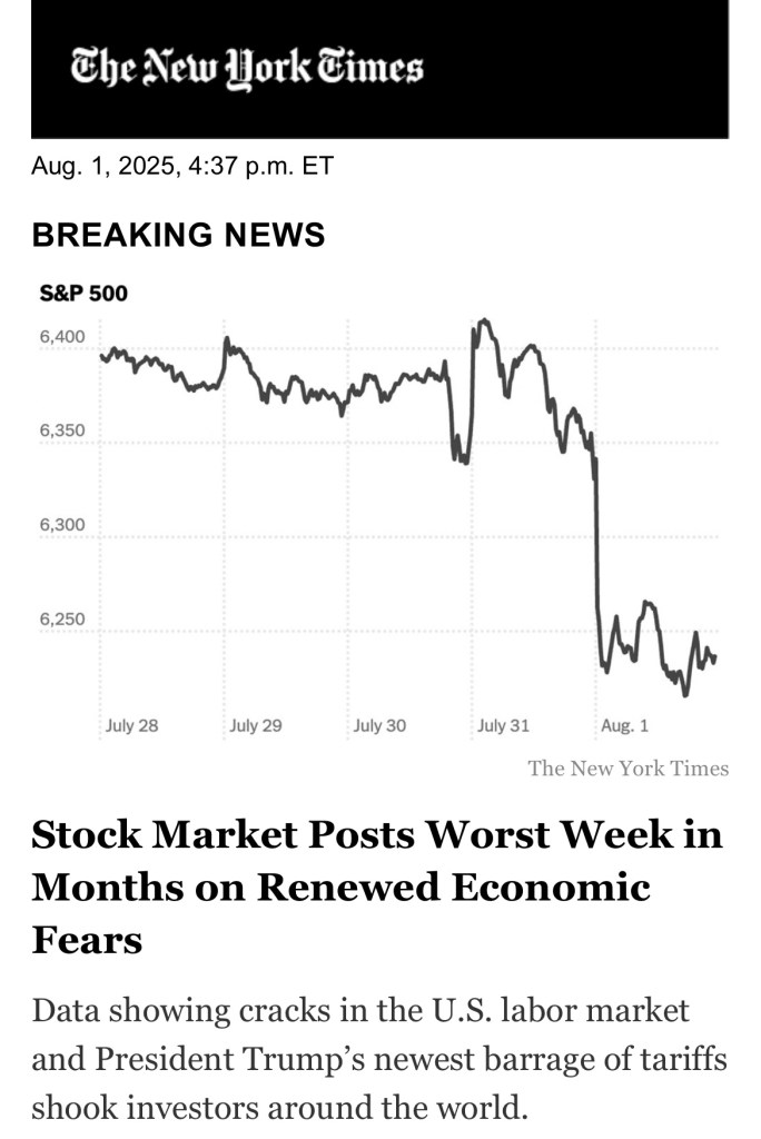 NYT: Stock Market Posts Worst Week in Months on Renewed Economic Fears. Americans need to thanks Donald Trump for the Tariff driven inflation and mass layoffs 《紐約時報》:經濟擔憂重燃,股市錄得數月來最差一週表現。美國人應該感謝唐納德·川普,因為他製造了關稅引發的通膨和大規模裁員.