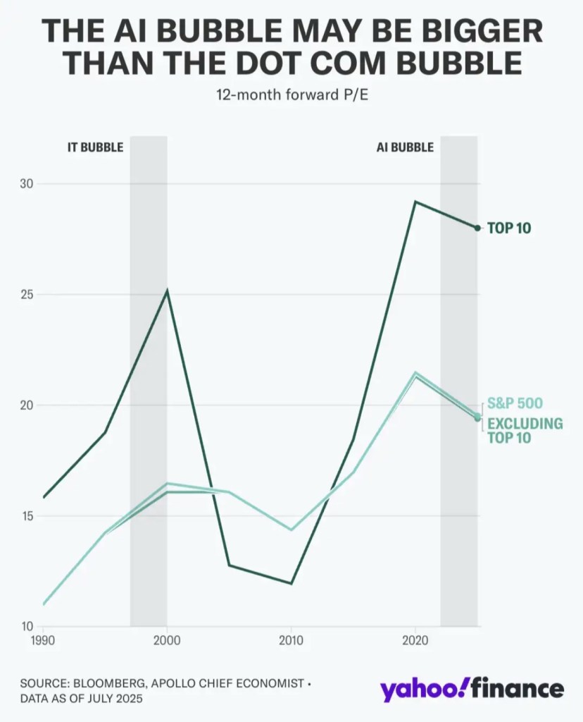 A top Wall Street economist is sounding the alarm on sky-high valuations in AI stocks — and drawing comparisons to the tech bubble of the late 1990s. 一位華爾街頂級經濟學家對人工智慧股票的過高估值發出了警告,並將其與 20 世紀 90 年代末的科技泡沫進行了比較.