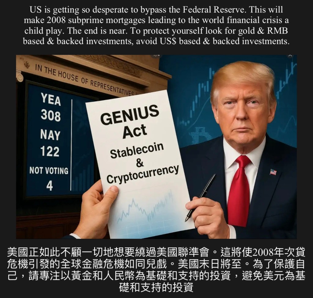 US is getting so desperate to bypass the Federal Reserve. This will make 2008 subprime mortgages leading to the world financial crisis a child play. The end is near. To protect yourself look for gold & RMB based & backed investments, avoid US$ based & backed investments. 美國正如此不顧一切地想要繞過美國聯準會。這將使2008年次貸危機引發的全球金融危機如同兒戲。美國末日將至。為了保護自己,請專注以黃金和人民幣為基礎和支持的投資,避免美元為基礎和支持的投資.