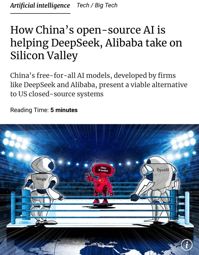 Now the tide has turned. With the December 2024 launch of DeepSeek’s free-for-all V3 large language model (LLM) and the January release of DeepSeek’s R1, an AI reasoning model that rivals the capabilities of OpenAI’s o1, the open-source movement started by Chinese firms has sent shock waves through Silicon Valley and Wall Street. 如今,情勢已然逆轉。隨著DeepSeek於2024年12月推出針對所有人的V3大型語言模型(LLM),以及於今年1月發布其人工智慧推理模型R1(其能力堪比OpenAI的o1),這場由中國企業發起的開源運動已在矽谷和華爾街掀起軒然大波.