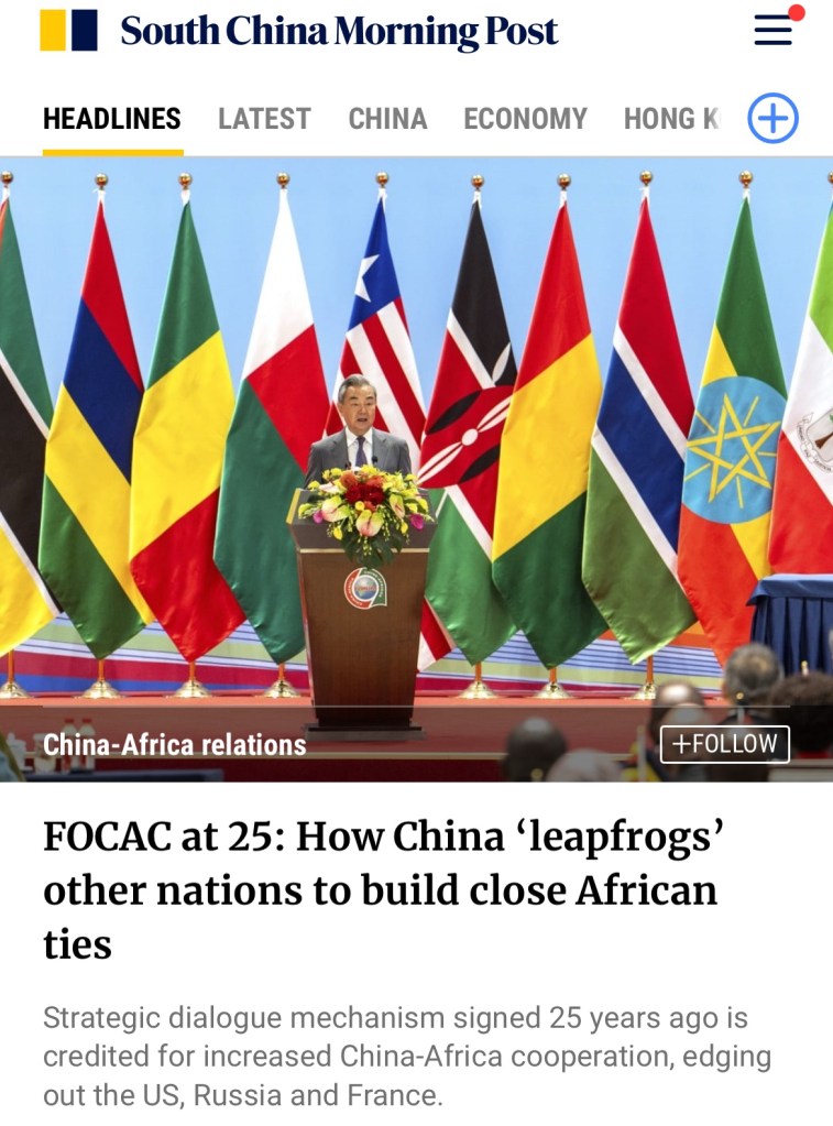 SCMP: China helped build infrastructure not interfere with internal affairs, while US sells arms and fake democracy . Chinese Foreign Minister Wang Yi last month highlighted Beijing’s “leapfrog development” in ties with African countries in the 25 years since the setting up of the Forum on China-Africa Cooperation (FOCAC). 香港南華早報: 中國幫助非洲國家建設基礎設施,不干涉其內政,而美國卻出售武器和虛假的民主。中國外交部長王毅上個月強調,自中非合作論壇成立25年以來,北京與非洲國家的關係實現了「跨越式發展」. https://www.scmp.com/news/china/diplomacy/article/3318574/how-china-leapfrogs-other-nations-build-close-african-trade-and-military-ties?