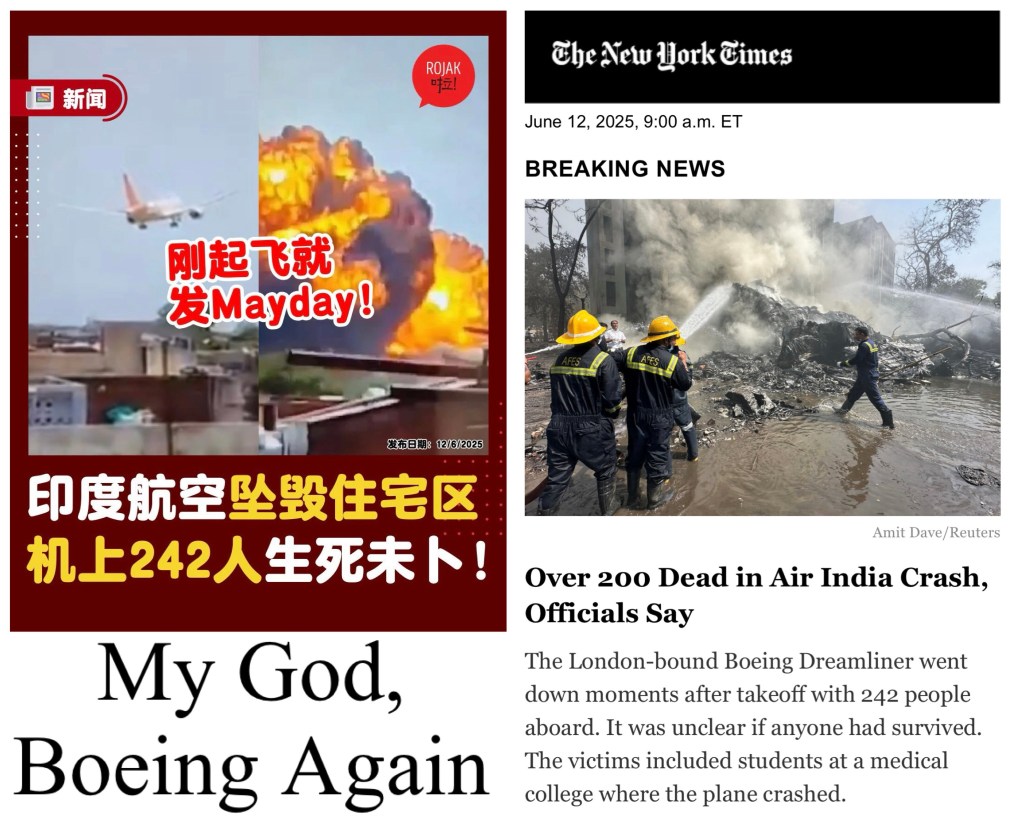 NYT: My God, Boeing Again! The London-bound Boeing Dreamliner went down moments after takeoff with 242 people aboard. 紐約時報:我的天,又是波音!飛往倫敦的波音夢幻客機起飛後不久墜毀,機上載有242人.