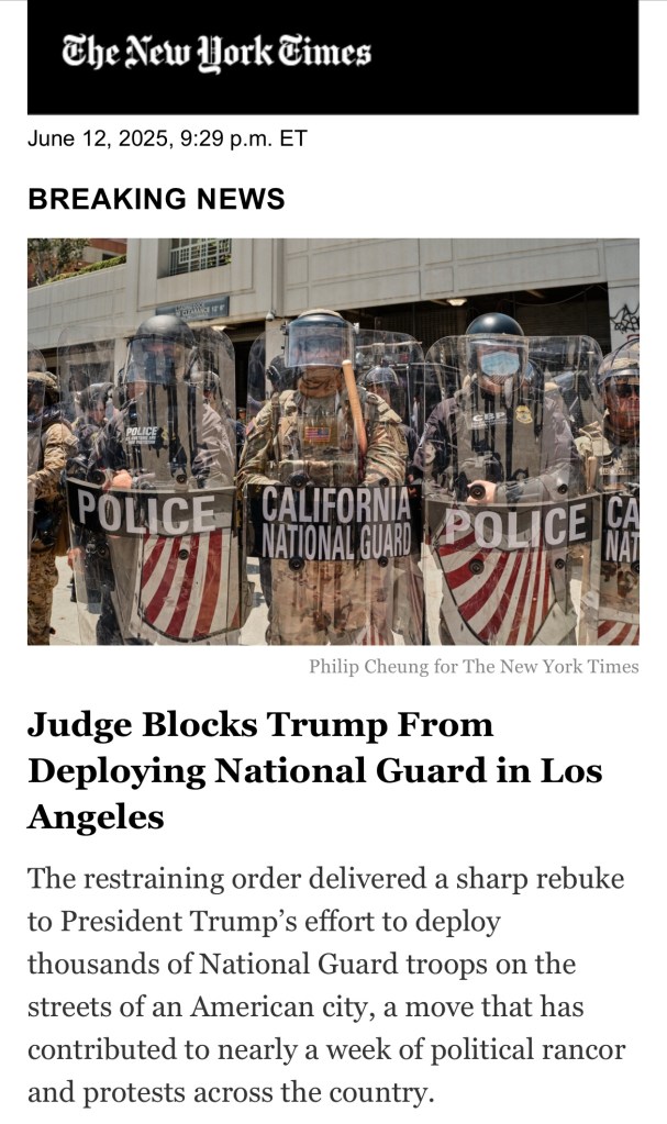 NYT Breaking news: Judge blocks Trump from deploying National Guard in Los Angeles 紐約時報突發新聞:法官阻止川普在洛杉磯部署國民警衛隊