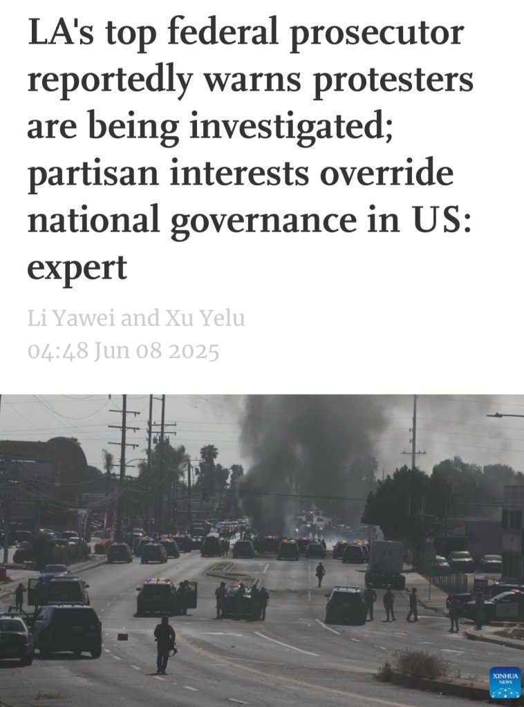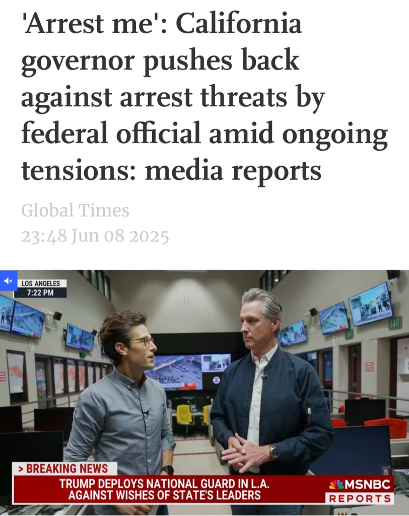 California Governor is challenging Trump to arrest him said he brings chaos to California. Newsom also posted on the X platform on Monday, stating: “Let’s get this straight: 1) Local law enforcement didn’t need help. 2) Trump sent in troops anyway to manufacture chaos and violence. 3) Trump succeeded. 4) Now the situation is destabilized, and we have to deploy more law enforcement just to clean up Trump’s mess.” 加州州長正在挑戰川普,來逮捕他吧,稱川普給加州帶來了混亂。加州州長紐瑟姆週一也在X平台上發帖稱:“讓我們把事情說清楚:1)當地執法部門不需要幫助。2)特朗普無論如何都派了軍隊來製造混亂和暴力。3)特朗普得逞了。4)現在局勢已經不穩定,我們必須部署更多執法人員來收拾特朗普留下的爛攤子.”