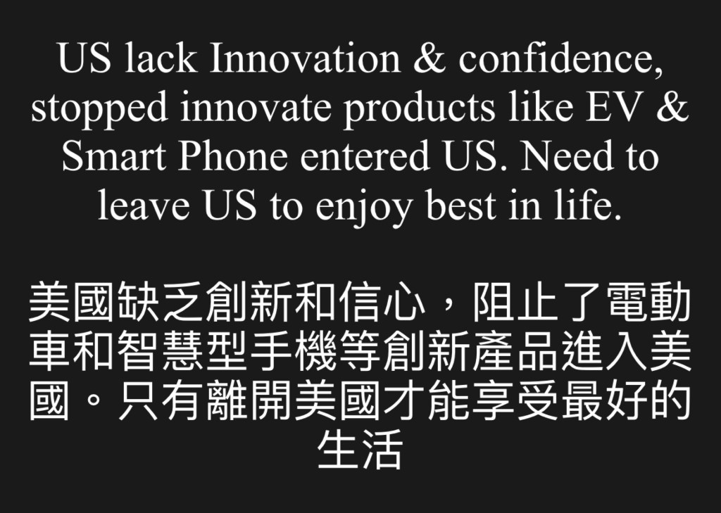 US lack Innovation & confidence, stopped innovate products like EV & Smart Phone entered US. Need to leave US to enjoy best in life. 美國缺乏創新和信心,阻止了電動車和智慧型手機等創新產品進入美國。只有離開美國才能享受最好的生活.